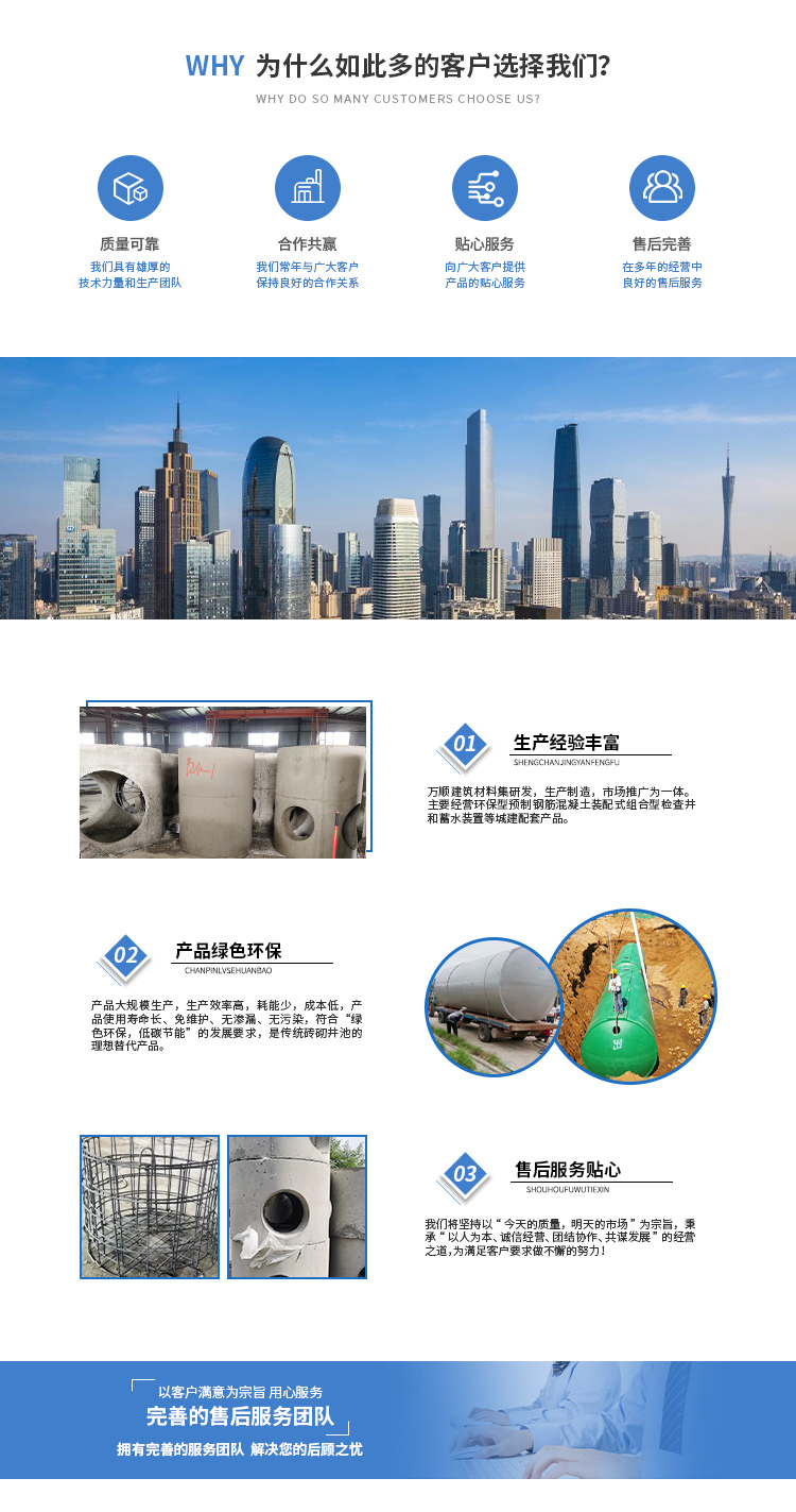 安徽萬渠建筑科技有限公司是集研發,生產制造,市場推廣為一體的綜合性企業。公司主要經營環保型預制鋼筋混凝土裝配式組合型檢查井和蓄水裝置等城建配套產品。產品生產過程采用獨特的生產工藝,機械化流水作業。產品大規模生產,生產效率高,耗能少,成本低,產品使用壽命長、免維護、無滲漏、無污染,符合“綠色環保,低碳節能”的發展要求,是傳統磚砌井池的理想替代產品。